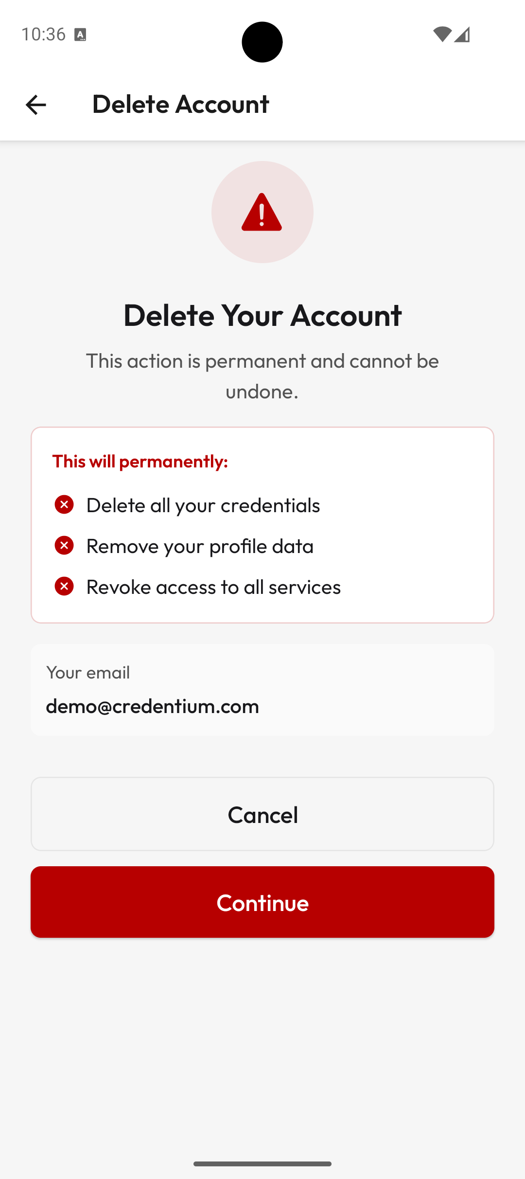 You can delete your Credentium account at any time through the mobile app or the Credentium Wallet web application. For your security, account deletion requires a multi-step verification process.